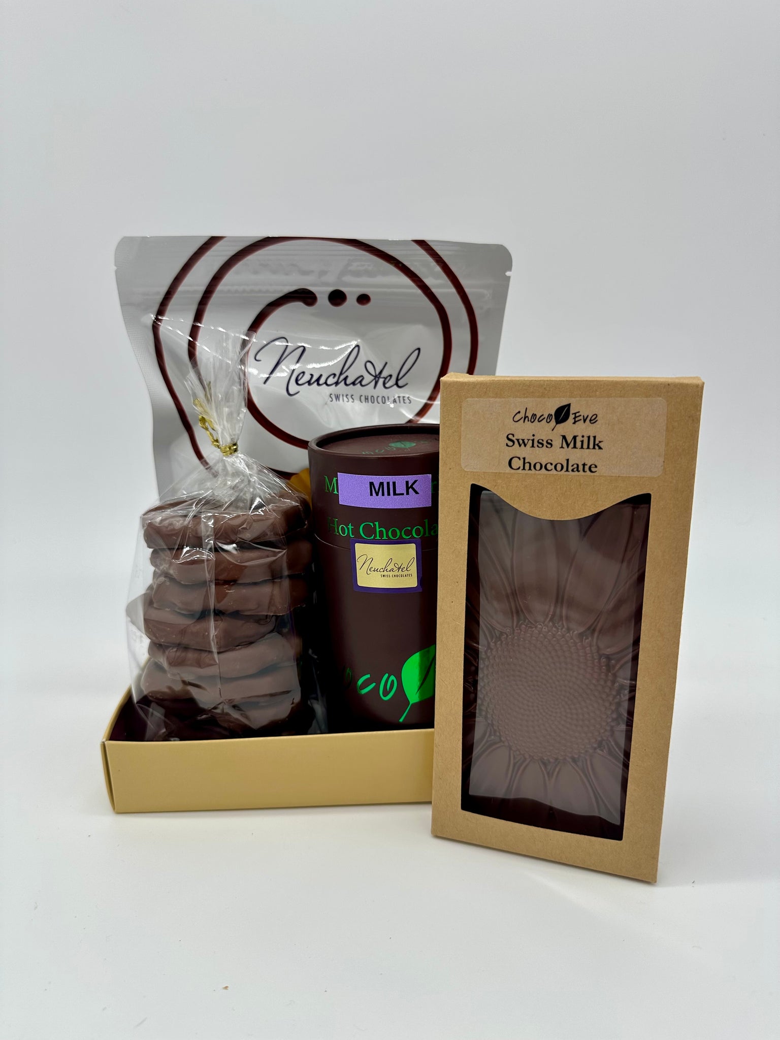 Gift our classic favorite's wrapped together in a simple stack! Each gift basket includes Swiss Chips, chocolate covered pretzels, hot chocolate, and a decorative chocolate bar.