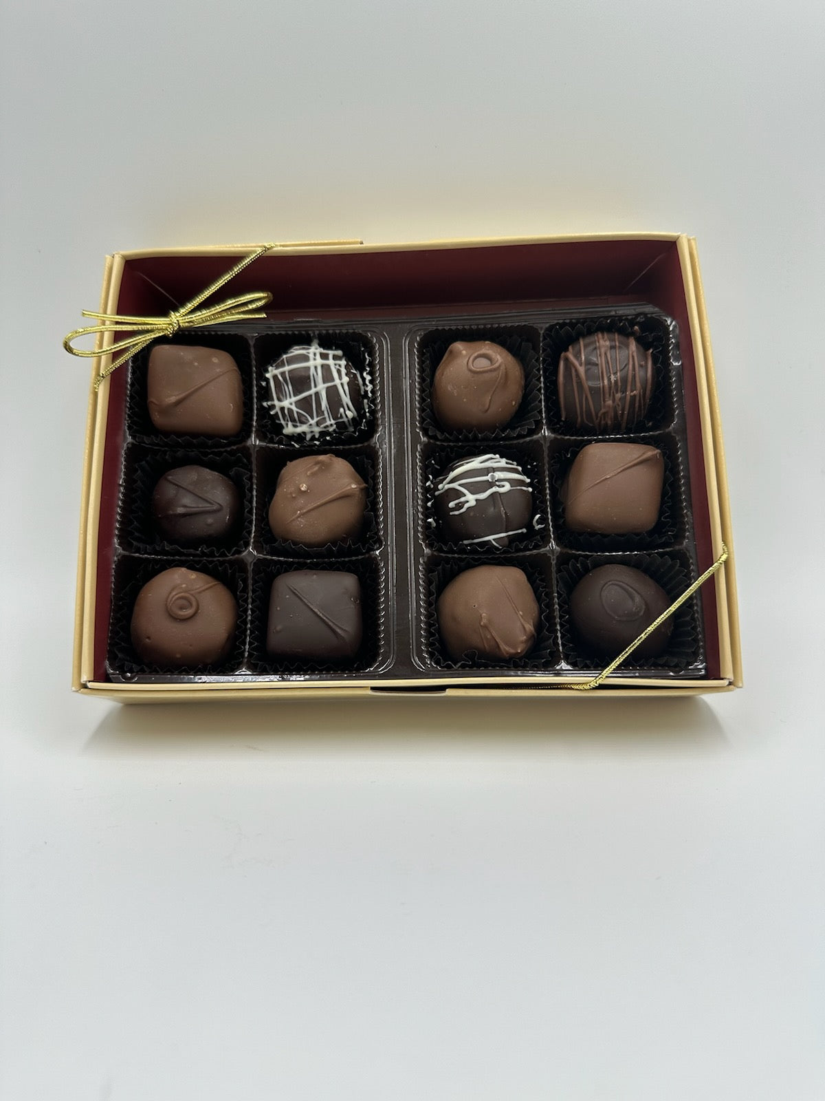 Our 12 piece assorted chocolates gift box is a delicious assortment of milk and dark chocolate buttercreams, caramels, and cherries!