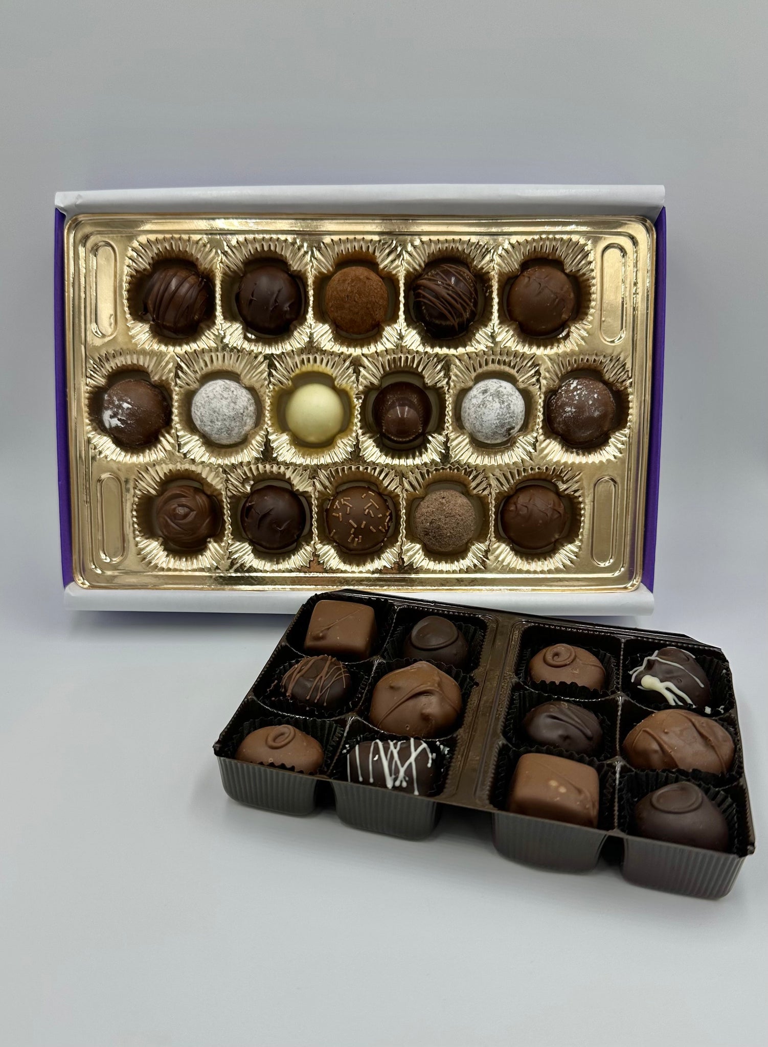 Enjoy the best of both confection worlds with our gift box stack! Each stack consists of one 16 piece gift box of assorted Swiss chocolate truffles, and one 12 piece gift box of assorted buttercreams and caramels.